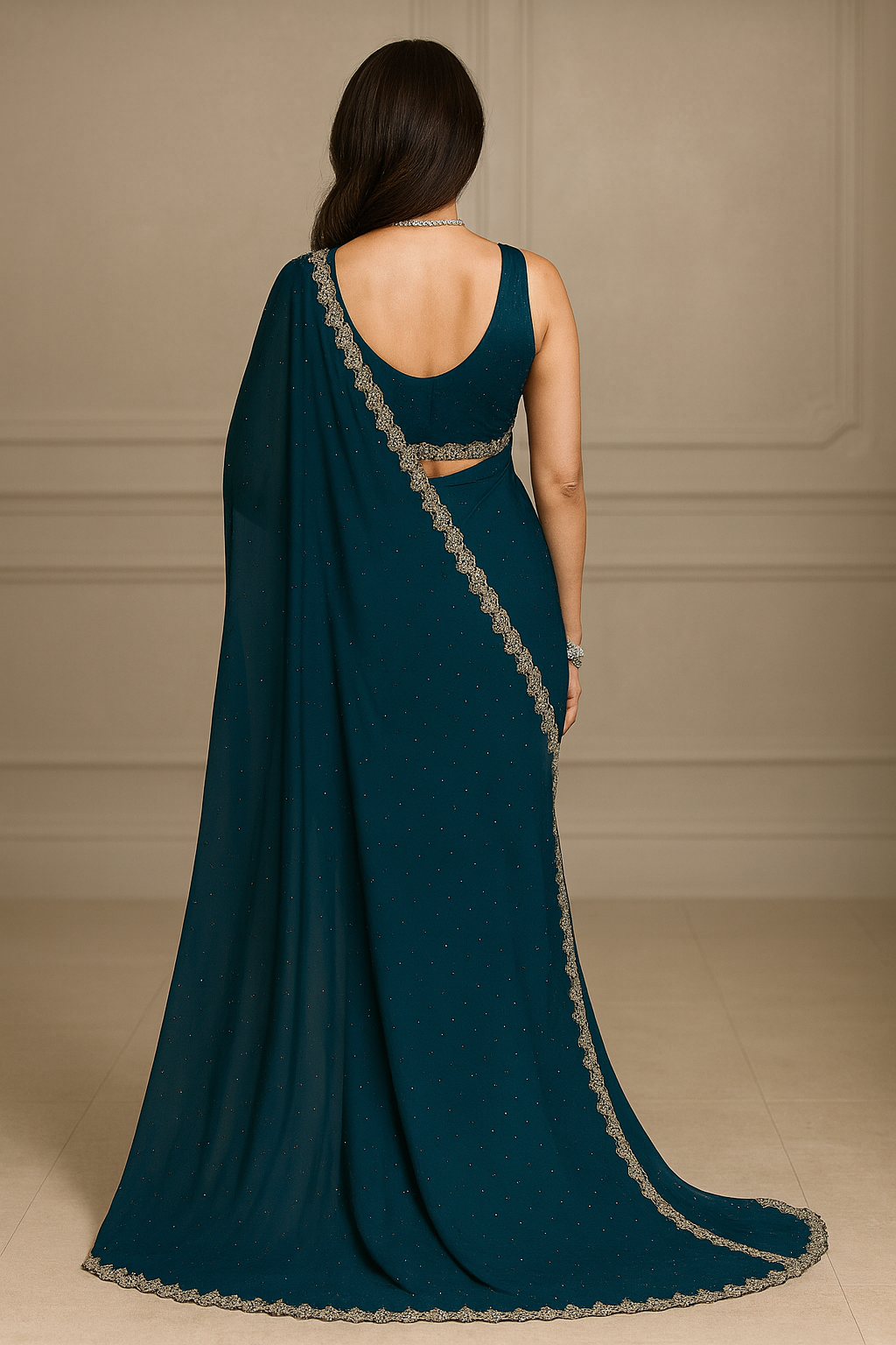 This exquisite saree from the Khwaahish Collection is crafted from a luxurious, premium lightweight georgette blend, designed to drape with elegant fluidity. Its captivating teal green color is both vibrant and sophisticated, making it a truly eye-catching piece. The saree is elevated by a delicate silver embroidered border, which adds a touch of shimmer and intricate detail, perfect for catching the light.